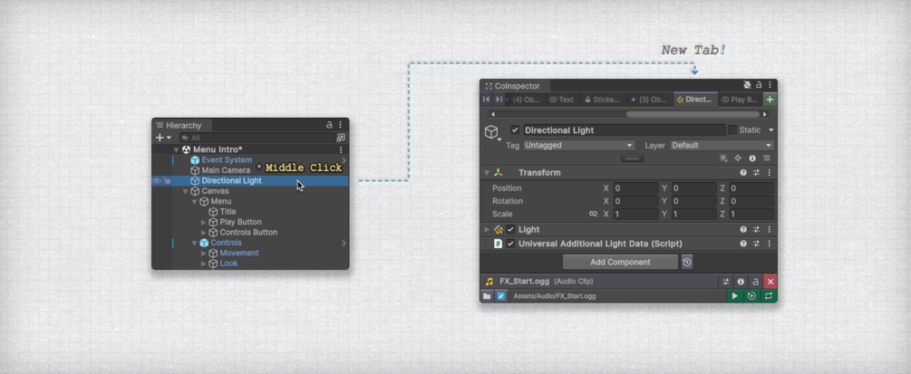Middle-click GameObjects to open Tabs, Select/ping Tabs, improved multi-selection, instant switch to Unity Inspector, copy Asset paths, Collapse/Expand Components with a click, Local Hierarchy View... and still more!
